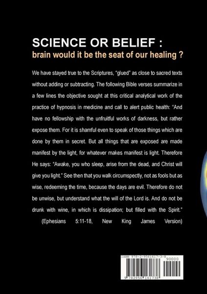 We have stayed true to the Scriptures, "glued" as closely as possible to sacred texts without adding or subtracting. The following Bible verses summarize in a few lines the objective sought at this critical analytical work of the practice of hypnosis in medicine and call to alert public health: "And do not participate in the unfruitful works of darkness, but otherwise expose them! [...] Take care to drive you carefully, not as fools, but as wise, redeeming the time, because the days are evil..." (Ephesians 5: 11-18, New King James Version)