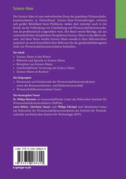 Der Science-Slam ist eine weitverbreitete Form der populären Wissenschaftskommunikation in Deutschland. Science-Slam-Veranstaltungen erfreuen sich großer Beliebtheit beim Publikum, stehen aber mitunter auch in der Kritik, da die Verbindung von Unterhaltung und Wissenschaftskommunikation als problematisch eingeschätzt wird. Der Band vereint Beiträge, die aus unterschiedlichen disziplinären Perspektiven Science-Slams in den Blick nehmen. Auf diese Weise werden Science-Slams sowohl in ihrer Mikrostruktur analysiert als auch hinsichtlich ihrer Relevanz für die gesellschaftsbezogenen Ziele von Wissenschaftskommunikation beleuchtet.