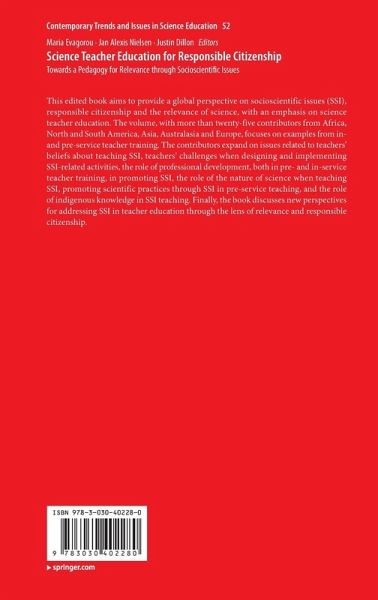 This edited book aims to provide a global perspective on socioscientific issues (SSI), responsible citizenship and the relevance of science, with an emphasis on science teacher education. The volume, with more than twenty-five contributors from Africa, North and South America, Asia, Australasia and Europe, focuses on examples from in- and pre-service teacher training. The contributors expand on issues related to teachers' beliefs about teaching SSI, teachers' challenges when designing and implementing SSI-related activities, the role of professional development, both in pre- and in-service teacher training, in promoting SSI, the role of the nature of science when teaching SSI, promoting scientific practices through SSI in pre-service teaching, and the role of indigenous knowledge in SSI teaching. Finally, the book discusses new perspectives for addressing SSI in teacher education through the lens of relevance and responsible citizenship.