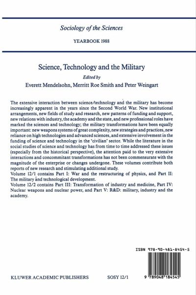 The extensive interaction between science/technology and the military has become increasingly apparent in the years since the Second World War. New institutional arrangements, new fields of study and research, new patterns of funding and support, new relations with industry, the academy and the state, and new professional roles have marked the sciences and technology; the military transformations have been equally important: new weapons systems of great complexity, new strategies and practices, new reliance on high technologies and advanced sciences, and extensive involvement in the funding of science and technology in the 'civilian' sector. While the literature in the social studies of science and technology has from time to time addressed these issues (especially from the historical perspective), the attention paid to the very extensive interactions and concommitant transformations has not been commensurate with the magnitude of the enterprise or changes undergone. These volumescontribute both reports of new research and stimulating additional study.Volume 12/1 contains Part I: War and the restructuring of physics, and Part II: The military and technological development.Volume 12/2 contains Part III: Transformation of industry and medicine, Part IV: Nuclear weapons and nuclear power, and Part V: R&D: military, industry and the academy.