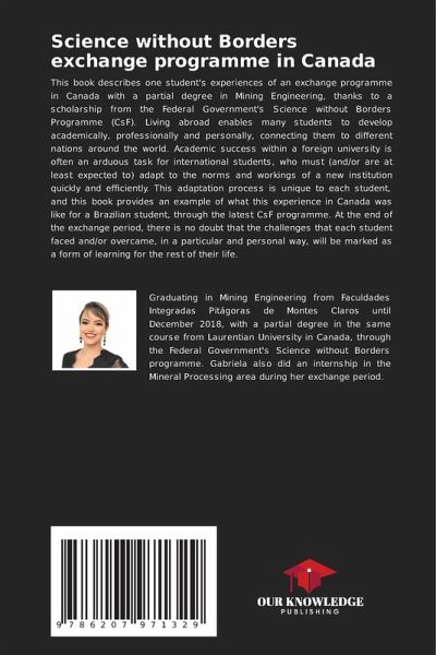 This book describes one student's experiences of an exchange programme in Canada with a partial degree in Mining Engineering, thanks to a scholarship from the Federal Government's Science without Borders Programme (CsF). Living abroad enables many students to develop academically, professionally and personally, connecting them to different nations around the world. Academic success within a foreign university is often an arduous task for international students, who must (and/or are at least expected to) adapt to the norms and workings of a new institution quickly and efficiently. This adaptation process is unique to each student, and this book provides an example of what this experience in Canada was like for a Brazilian student, through the latest CsF programme. At the end of the exchange period, there is no doubt that the challenges that each student faced and/or overcame, in a particular and personal way, will be marked as a form of learning for the rest of their life.