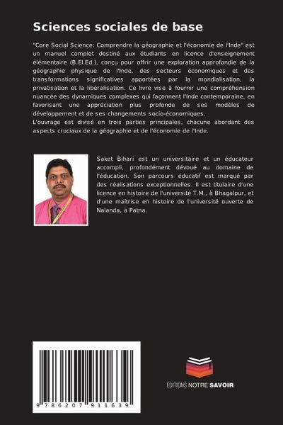 "Core Social Science: Comprendre la géographie et l'économie de l'Inde" est un manuel complet destiné aux étudiants en licence d'enseignement élémentaire (B.El.Ed.), conçu pour offrir une exploration approfondie de la géographie physique de l'Inde, des secteurs économiques et des transformations significatives apportées par la mondialisation, la privatisation et la libéralisation. Ce livre vise à fournir une compréhension nuancée des dynamiques complexes qui façonnent l'Inde contemporaine, en favorisant une appréciation plus profonde de ses modèles de développement et de ses changements socio-économiques.L'ouvrage est divisé en trois parties principales, chacune abordant des aspects cruciaux de la géographie et de l'économie de l'Inde.