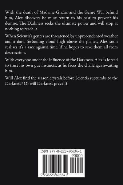 With the death of Madame Gnaris and the Genre War behind him, Alex discovers he must return to his past to prevent his demise. The Darkness seeks the ultimate power and will stop at nothing to reach it. When Scientia's genres are threatened by unprecendented weather and a dark forboding cloud high above the planet, Alex soon realises it's a race against time, if he hopes to save them all from destruction. With everyone under the influence of the Darkness, Alex is forced to trust his own gut instincts, as he faces the challenges awaiting him. Will Alex find the season crystals before Scientia succumbs to the Darkness? Or will Darkness prevail?