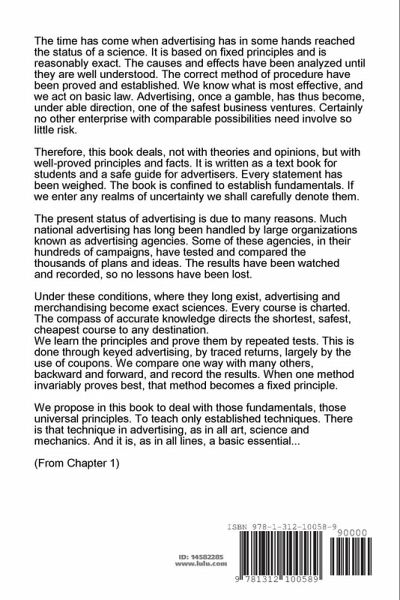 The time has come when advertising has in some hands reached the status of a science. It is based on fixed principles and is reasonably exact. The causes and effects have been analyzed until they are well understood. The correct method of procedure have been proved and established. We know what is most effective, and we act on basic law. Advertising, once a gamble, has thus become, under able direction, one of the safest business ventures. Certainly no other enterprise with comparable possibilities need involve so little risk. Therefore, this book deals, not with theories and opinions, but with well-proved principles and facts. The book is confined to establish fundamentals. If we enter any realms of uncertainty we shall carefully denote them. Under these conditions, where they long exist, advertising and merchandising become exact sciences. Every course is charted. The compass of accurate knowledge directs the shortest, safest, cheapest course to any destination. Get Your Copy Today!