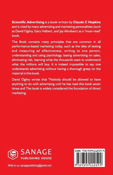 Scientific Advertising is a book written by Claude C Hopkins and is cited by many advertising and marketing personalities (such as David Ogilvy, Gary Halbert, and Jay Abraham) as a ""must-read"" book. The Book contains many principles that are common in all performance-based marketing today, such as the idea of testing and measuring ad effectiveness, writing to one person, understanding and using psychology, basing advertising on sales, eliminating risk, learning what the thousands want to understand what the millions will buy. It is indeed impossible to say one understands advertising without having a thorough grasp on the material in this book. David Ogilvy wrote that ""Nobody should be allowed to have anything to do with advertising until he has read this book seven times and The book is widely considered the foundation of direct marketing.