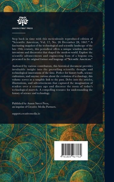 Step back in time with this meticulously reproduced edition of "Scientific American, Vol. 17, No. 26 December 28, 1867." A fascinating snapshot of the technological and scientific landscape of the late 19th century, this periodical offers a unique window into the inventions and discoveries that shaped the modern world. Explore the scientific advancements and engineering feats of a bygone era, presented in the original format and language of "Scientific American." Authored by various contributors, this historical document provides invaluable insight into the prevailing scientific thought and technological innovations of the time. Perfect for history buffs, science enthusiasts, and anyone curious about the evolution of technology, this volume serves as a tangible link to the past. Delve into the articles, illustrations, and advertisements that captured the imagination of readers over a century ago and discover the roots of today's technological marvels. A compelling resource for understanding the history of science and technology. This work has been selected by scholars as being culturally important, and is part of the knowledge base of civilization as we know it. This work is in the public domain in the United States of America, and possibly other nations. Within the United States, you may freely copy and distribute this work, as no entity (individual or corporate) has a copyright on the body of the work. Scholars believe, and we concur, that this work is important enough to be preserved, reproduced, and made generally available to the public. We appreciate your support of the preservation process, and thank you for being an important part of keeping this knowledge alive and relevant.