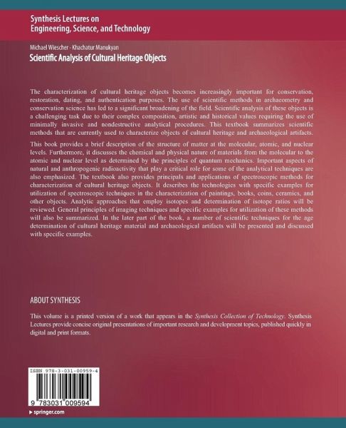 This book provides a brief description of the structure of matter at the molecular, atomic, and nuclear levels. Furthermore, it discusses the chemical and physical nature of materials from the molecular to the atomic and nuclear level as determined by the principles of quantum mechanics. Important aspects of natural and anthropogenic radioactivity that play a criticalrole for some of the analytical techniques are also emphasized. The textbook also provides principals and applications of spectroscopic methods for characterization of cultural heritage objects. It describes the technologies with specific examples for utilization of spectroscopic techniques in the characterization of paintings, books, coins, ceramics, and other objects. Analytic approaches that employ isotopes and determination of isotope ratios will be reviewed. General principles of imaging techniques and specific examples for utilization of these methods will also be summarized. In the later part of the book, a number of scientific techniques for the age determination of cultural heritage material and archaeological artifacts will be presented and discussed with specific examples.