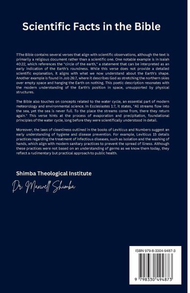 Scientific Facts in the Bible Dr. Maxwell Shimba's work, Scientific Facts in the Bible, intricately combines mathematical and scientific principles with biblical narratives to showcase the depth of divine design. Below are seven paragraphs summarizing key scientific and mathematical insights drawn from his text.The Mathematical Origin in the Bible Dr. Shimba highlights that mathematics is not a human invention but a divine creation rooted in God's perfection. He references Colossians 1:16, emphasizing that all things, visible and invisible, were created by God, including the logic and consistency underlying mathematics. The numbering of creation days in Genesis is seen as an early example of God's mathematical design. Factorial Notation in Miracles A unique perspective on the feeding of the 5,000 connects Jesus' miraculous multiplication of loaves and fish to factorial growth. Shimba interprets factorial notation, a tool in combinatorics, to symbolize the immense potential of divine multiplication, illustrating that God's provision transcends natural laws, emphasizing abundance and sufficiency. Mathematical Representation of the Trinity The Trinity-Father, Son, and Holy Spirit-is explored through mathematical operations. Dr. Shimba uses the ternary system and multiplication (1 × 1 × 1 = 1) to symbolically represent the unity and co-equality of the three divine persons. He argues this mathematical model reflects their shared infinite nature and indivisible essence. Symbolic Numbers in Prophecy In Daniel's "Seventy Weeks Prophecy," Shimba underscores the mathematical precision predicting Messiah's arrival. The weeks are interpreted as symbolic years, demonstrating a calculated divine timeline. The prophecy spans 490 years, showcasing God's sovereignty and perfect orchestration of historical and messianic events. Scientific Facts in Natural Laws Dr. Shimba aligns scientific discoveries with biblical texts. For instance, he references Job 26:7, which describes the Earth as hanging on nothing, correlating with the concept of Earth floating in space. Similarly, Ecclesiastes 1:7's depiction of the water cycle predates modern meteorological science, exemplifying the Bible's advanced insights. Jonah's Survival and Divine Science The story of Jonah in the belly of the fish is examined through both faith and science. Dr. Shimba discusses possible natural mechanisms for survival, like air pockets and metabolic suspension, while emphasizing the miracle as an act of divine intervention, underscoring the Bible's layered narratives of human experience and supernatural power. Dr. Shimba's work underscores the intricate interplay of mathematics, science, and theology, asserting that the Bible not only conveys spiritual truths but also aligns with and often predates modern scientific principles.