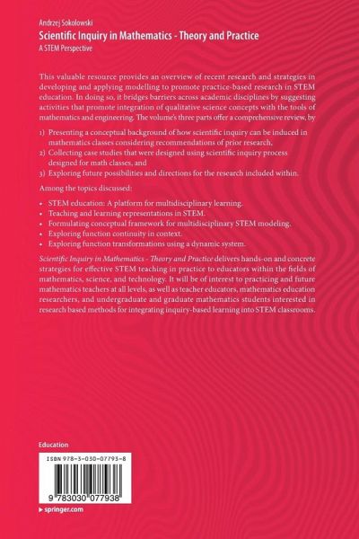 Scientific Inquiry in Mathematics - Theory and Practice delivers hands-on and concrete strategies for effective STEM teaching in practice to educators within the fields of mathematics, science, and technology. It will be of interest to practicing and future mathematics teachers at all levels, as well as teacher educators, mathematics education researchers, and undergraduate and graduate mathematics students interested in research based methods for integrating inquiry-based learning into STEM classrooms.