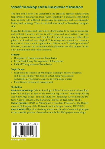 The aim of this book is to understand and critically appraise science-based transgression dynamics in their whole complexity. It includes contributions from experts with different disciplinary backgrounds, such as philosophy, history and sociology. Thus, it is in itself an example of boundary transgression.Scientific disciplines and their objects have tended to be seen as permanent and distinct. However, science is better conceived as an activity that constantly surpasses, erases and rebuilds all kinds of boundaries, either disciplinary, socio-ethical or ecological. This transgressive capacity, a characteristic trait of science and its applications, defines us as "knowledge societies." However, scientific and technological developments are also sources of serious environmental and social concerns.
