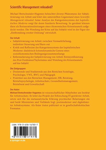 Michael Bretschneider-Hagemes beleuchtet diverse Phänomene der Subjektivierung von Arbeit und klärt den unterstellten Gegenstand eines Scientific Management reloaded . Seine Analyse des Kategoriensystems der kapitalistischen Moderne sorgt für deren fundierte Bewertung. So gerahmt können diese als Restaurationsleistungen eines ökonomischen Krisentaumels aufgedeckt werden. Die Wendung der Krise auf das Subjekt wird in der Figur der "Entfremdung zweiter Ordnung" entwickelt.