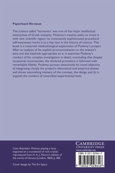 The science called 'harmonics' was one of the major intellectual enterprises of Greek antiquity. Ptolemy's treatise seeks to invest it with new scientific rigour; its consistently sophisticated procedural self-awareness marks it as a key text in the history of science. This book is a sustained methodological exploration of Ptolemy's project. After an analysis of his explicit pronouncements on the science's aims and the methods appropriate to it, it examines Ptolemy's conduct of his investigation in detail, concluding that despite occasional uncertainties, the declared procedure is followed with remarkable fidelity. Ptolemy pursues tenaciously his novel objective of integrating closely the project's theoretical and empirical phases and shows astonishing mastery of the concept, the design and the conduct of controlled experimental tests. By opening up this neglected text to historians of science, the book aims to provide a point of departure for wider studies of Greek scientific method.