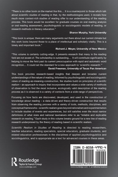 This book provides research-based insights that deepen and broaden current understandings of the nature of reading. Informed by psycholinguistic and sociolinguistic views of reading-as-meaning-construction, the studies build on principles of scientific realism - an approach to inquiry that incorporates and values a wide variety of methods of observation to find the most inclusive, ecologically valid description of the reading process as it is observed in a variety of contexts from a wide range of perspectives. Focusing on how facts are discovered, developed, and used in the construction of knowledge about reading - a data-driven and theory-driven construction that results from observing the reading process with a variety of tools, methods, disciplines, and conceptual frameworks - scientific realism goes beyond rationalism and experimentation to include studies of events and experiences, but still satisfies even the most narrow definitions of what state and national lawmakers refer to as "reliable and replicable research on reading." Each study in this volume breaks ground for a new line of reading research underpinned by the theory of reading based in scientific realism. Scientific Realism in Studies of Reading is directed to reading researchers, teacher educators, reading specialists, special educators, graduate students, and related education professionals in the disciplines of applied psycholinguistics and sociolinguistics, and is appropriate as a text for advanced courses in these areas.