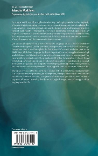 Qin and Fahringer present a novel workflow language called Abstract Workflow Description Language (AWDL) and the corresponding standards-based, knowledge-enabled tool support, which simplifies the development of scientific workflow applications. AWDL is an XML-based language for describing scientific workflow applications at a high level of abstraction. It is designed in a way that allows users to concentrate on specifying such workflow applications without dealing with either the complexity of distributed computing environments or any specific implementation technology. This research monograph is organized into five parts: overview, programming, optimization, synthesis, and conclusion, and is complemented by an appendix and an extensive reference list.