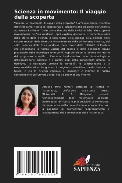 "Scienza in movimento: Il viaggio della scoperta" è un'esplorazione completa dell'incessante ricerca di conoscenza e comprensione da parte dell'umanità attraverso i millenni. Dalle prime ricerche delle civiltà antiche alle scoperte rivoluzionarie dell'era moderna, ogni capitolo ripercorre i momenti cruciali della storia della scienza. Il libro tratta della nascita della scienza nelle culture antiche, della rinascita rinascimentale della conoscenza classica, del salto quantico della fisica moderna, delle teorie della relatività di Einstein che rimodellano la nostra visione del cosmo e delle possibilità future presentate dalle tecnologie emergenti. Approfondisce le dimensioni etiche del progresso scientifico, l'impatto trasformativo della biotecnologia e dell'esplorazione spaziale e i confini etici della conoscenza umana. In definitiva, la narrazione celebra la curiosità, la collaborazione e la responsabilità etica che guidano il progresso scientifico, dando forma a un futuro in cui la scienza continua a illuminare e ispirare la nostra comprensione dell'universo e del nostro posto al suo interno.