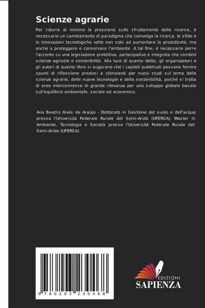 Per ridurre al minimo la pressione sullo sfruttamento delle risorse, è necessario un cambiamento di paradigma che coinvolga la ricerca, le sfide e le innovazioni tecnologiche volte non solo ad aumentare la produttività, ma anche a proteggere e conservare l'ambiente. A tal fine, è necessario porre l'accento su una legislazione protettiva, partecipativa e integrata che combini scienze agricole e sostenibilità. Alla luce di quanto detto, gli organizzatori e gli autori di questo libro si augurano che i capitoli pubblicati possano fornire spunti di riflessione preziosi e stimolanti per nuovi studi sul tema delle scienze agrarie, delle nuove tecnologie e della sostenibilità, poiché si tratta di aree interconnesse di grande rilevanza per uno sviluppo globale basato sull'equilibrio ambientale, sociale ed economico.