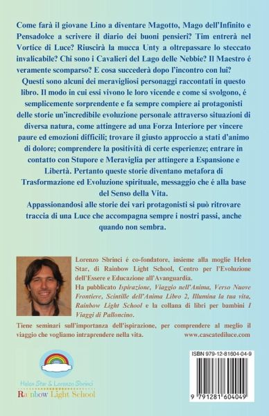 Come farà il giovane Lino a diventare Magotto, Mago dell'Infinito e Pensadolce a scrivere il diario dei buoni pensieri? Tim entrerà nel Vortice di Luce? Riuscirà la mucca Unty a oltrepassare lo steccato invalicabile? Chi sono i Cavalieri del Lago delle Nebbie? Il Maestro é veramente scomparso? E cosa succederà dopo l'incontro con lui? Questi sono alcuni dei meravigliosi personaggi raccontati in questo libro. Il modo in cui essi vivono le loro vicende e come si svolgono, é semplicemente sorprendente e fa sempre compiere ai protagonisti delle storie un'incredibile evoluzione personale attraverso situazioni di diversa natura, come attingere ad una Forza Interiore per vincere paure ed emozioni difficili; trovare il giusto approccio a stati d'animo di dolore; comprendere la positività di certe esperienze; entrare in contatto con Stupore e Meraviglia per attingere a Espansione e Libertà. Pertanto queste storie diventano metafora di Trasformazione ed Evoluzione spirituale, messaggio che é alla base del Senso della Vita. Appassionandosi alle storie dei vari protagonisti si può ritrovare traccia di una Luce che accompagna sempre i nostri passi, anche quando non sembra.