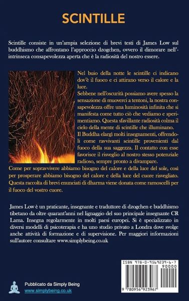 Scintille è l'ottavo libro di questo popolare autore, e il quarto pubblicato in italiano. Si tratta di una raccolta informale di brevi scritti e di poesie, frutto della sua pluriennale esperienza di pratica e insegnamento del Buddhismo. La lettura di questa agile raccolta in prosa e poesia può essere iniziata, goduta e meditata da un punto qualsiasi, poiché ogni "scintilla" o "frammento" sono completi in sé stessi. L'argomento è profondo, eppure è condensato ed espresso in un linguaggio semplice, ricorrendo a esempi e metafore tratti dalla vita quotidiana e dal mondo vivente che ci circonda. In un linguaggio semplice e bello, la raccolta esprime la profonda visione non duale dello Dzogchen, che illumina il vivificante potenziale di Buddha presente in tutti noi. I libri di James Low sono stati tradotti in estone, francese, tedesco, italiano, polacco, portoghese e spagnolo. James Low ha concluso di recente la sua attività di Psicoterapeuta presso il Servizio Sanitario Nazionale con sede a Londra, ma continua a esercitare privatamente nel suo studio. Inoltre, ha insegnato in molte scuole di psicoterapia, alcune in Italia, ma per lo più in Inghilterra.James Low has now retired from his post as a Consultant Psychotherapist in the National Health Service. He maintains a small private psychotherapy practice in London and has taught in many psychotherapy institutes, mostly in the UK.