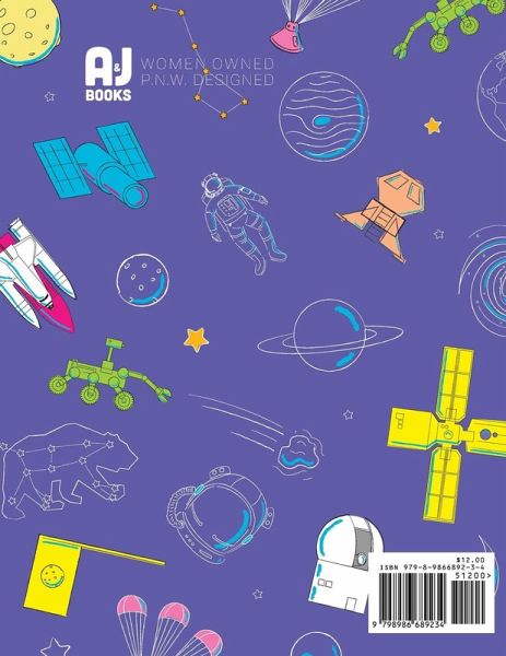 Have you ever wanted to build a 2 foot space rover? Well now you can with the Color, Cut, & Create Space Activity Book! Inside you'll find pages & pages of hand drawn outer space themed coloring & scissor activities from building a rocket ship for the launch pad, learning about constellations, putting planets in order, drawing yourself in an astronaut suit, & much more! Begin with warm up pages to help your hand muscles get ready for the creative fun, then progress into different shapes. Learn space facts, glue together giant craft activities, practice fine motor skills, & writing your name on your astronaut helmet. In the back of the book you will find suggestions on how to learn through play while using the cut- outs in the "creations continued" section. Use the dotted lines as a guide for kids still strengthening their scissor skills & for kids with more advanced skills, can cut along the image outlines (except for the giant glue together builds). The ideal gift for the space curious kids looking to create their very own outer space world. Have fun creating! The Book Contains: Hand drawn designs Warm up pages 40 plus images to color & cut out Oversized cut & paste builds to play with Fun facts Learning prompts in the back of the book Ages 4 -10 have enjoyed creating with these scissor skills books. (not recommended for first time scissor users.) Want to learn more about our women owned small business? Check out our catalog of books at aandjbooks.shop and download our free activities! Get social with us @a_and_jbooks for product launches, giveaways, events, & video tutorials. All A & J Books content is original artwork protected by copyright laws that cannot be used in any format or distributed without written consent of A & J Books LLC