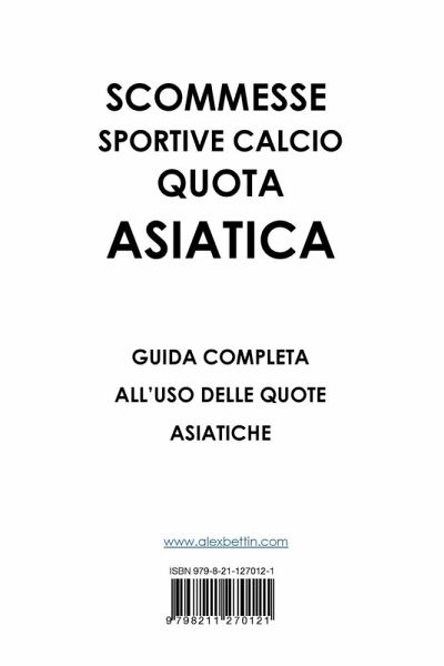 "La Potenza è nulla Senza Controllo! Mai così vero come nel Betting Sportivo. Sei d'accordo? Sei d'accordo con me che senza controllo prima o poi ti schianti? Gli orientali lo sanno bene, molto più introspettivi e riflessivi di noi occidentali, non a caso la Strategia di Betting principale in quei Paesi è proprio quella che sfrutta le quote "Asiatiche". In questo nuovo libro guida vi racconto come potrai sfruttare anche tu la POTENZA delle Quote Asiatiche e di come rappresentino il miglior fattore di CONTROLLO per MANTENERE UN ANDAMENTO POSITIVO COSTANTE E DI LUNGO PERIODO Se vuoi imparare ad usare al meglio le quote Asiatiche in questo libro guida scoprirai: * Qual'è la filosofia guida delle quotazioni Asiatiche * Come interpretare correttamente il significato delle quotazioni Asiatiche * Perché dovresti usare anche tu le quotazioni Asiatiche per tenere sotto controllo la tua Strategia di Betting * Come io personalmente integro le quotazioni Asiatiche nelle mie diverse Strategie operative di Betting * Significato e Vantaggi delle quotazioni Asiatiche con decimali Se vuoi anche tu imparare a sfruttare la Potenza delle Quotazioni Asiatiche per operare con profitti costanti e un perfetto controllo del Budget questo libro fa al caso tuo. Acquista ora e ricorda, La Potenza è Nulla senza il Controllo.