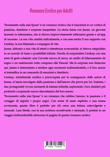 "Scommetto sulla mia Sposa" è un romanzo erotico che ti trascinerà in un vortice di passione, desiderio e sorprese inaspettate. La storia inizia con James, un giovane laureato in informatica, che si ritrova improvvisamente milionario grazie a un'app di successo. La sua vita cambia radicalmente, e con essa anche il suo rapporto con Lindsay, la sua fidanzata e compagna di vita.James, abituato a una vita di stenti e ristrettezze economiche, si ritrova catapultato in un mondo di lusso e possibilità infinite. Decide di sorprendere Lindsay con una serie di gesti eclatanti: una Corvette nuova di zecca, un anello di fidanzamento da sogno e un matrimonio tutto compreso alle Hawaii. Ma le sorprese non finiscono qui. James è determinato a rendere ogni momento indimenticabile, e il loro amore si intensifica in un crescendo di emozioni e desiderio.Lindsay, inizialmente scettica e preoccupata per le conseguenze delle azioni di James, si lascia travolgere dalla passione e dall'amore che prova per lui. Insieme, i due protagonisti vivono momenti di intensa intimità, esplorando i loro desideri più profondi e scoprendo nuove sfaccettature del loro amore."Scommetto sulla mia Sposa" è un romanzo che celebra l'amore, la passione e il coraggio di seguire i propri sogni. Con scene di sesso esplicito e una trama avvincente, questo libro è perfetto per chi cerca una lettura coinvolgente e sensuale. Lara Steele, con la sua scrittura accattivante e sensuale, ti porterà in un viaggio indimenticabile attraverso le pagine di questo romanzo erotico.