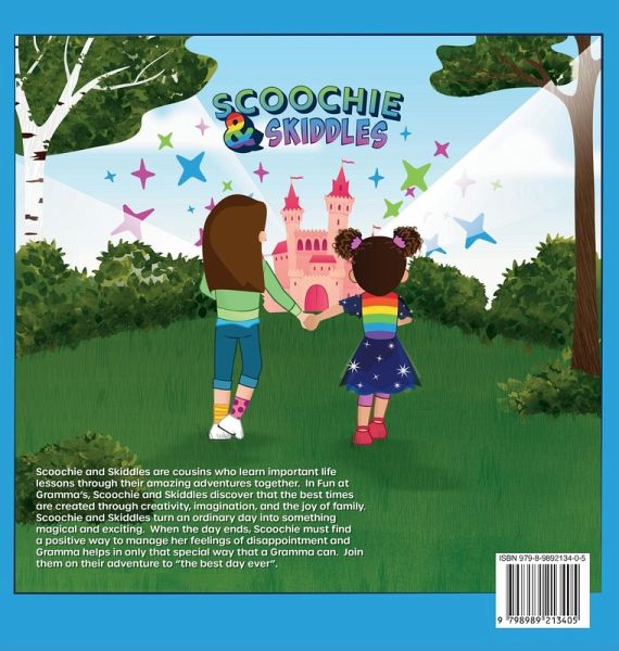 Scoochie and Skiddles are cousins who turn an ordinary day at their grandmother's house into something extraordinary. Using only imagination, creativity and a little help from "Gramma", the girls are transformed into princesses, complete with a castle built from furniture cushions and costumes that are courtsey of Gramma's and Grumps' (that's their grandfather) closet. Like many five year olds, Scoochie's is on the verge of a temper tantrum when her daddies inform her it is time to go home. Gramma comes to the rescue and, like grandmom's always do, helps prevent the meltdown. Fun at Gramma's reminds us that the some of the most special moments in life are the memories made with family. While the book is intended for children, adults who read it to their children will likely feel nostalgic about the days when the depths of imagination created countless hours of fun. The book captures the exuberance and innocence of childhood, and is a perfect read for children of all ages. Hopefully though, the best part of this book is what comes after the last page has been read - an opportunity for adults and children to get on the floor and start creating their own adventure ... their own "best day ever!" Enjoy.