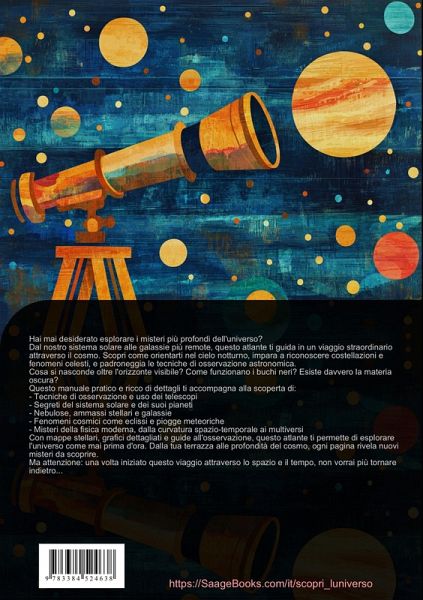 Benvenuti in un viaggio affascinante attraverso lo spazio profondo con questo atlante di astronomia completo e dettagliato. Questo manuale di astronomia offre un percorso strutturato per esplorare l'universo, dalle basi fino ai concetti più avanzati.Il libro si sviluppa in cinque sezioni principali:Nella prima parte, dedicata alle fondamenta dell'astronomia, vengono presentate le tecniche di osservazione, i diversi tipi di telescopi e come orientarsi nel cielo notturno. Imparerete a utilizzare strumenti astronomici essenziali e mappe stellari.La seconda sezione vi guida attraverso il nostro sistema solare, con dettagliate spiegazioni su come osservare i pianeti, dal vicino Mercurio fino ai giganti ghiacciati Urano e Nettuno. Include anche sezioni specifiche su asteroidi, comete e l'osservazione del Sole.La terza parte vi porta nel cosmo profondo, esplorando galassie, nebulose e ammassi stellari. Scoprirete come identificare e osservare questi oggetti celesti distanti.La quarta sezione affronta i fenomeni astrofisici, dalla comprensione della raumzeit all'analisi della radiazione cosmica, includendo concetti come la materia oscura.L'ultima parte è dedicata all'esplorazione spaziale, con guide per l'osservazione di stazioni spaziali e l'utilizzo di atlanti celesti.Ogni capitolo è arricchito da grafici, diagrammi e mappe dettagliate che rendono accessibili anche i concetti più complessi. Un'opera che accompagna sia chi muove i primi passi nell'astronomia sia chi desidera approfondire la propria conoscenza dello spazio.Questo libro è stato creato utilizzando tecnologie innovative come l'Intelligenza Artificiale e strumenti sviluppati appositamente - ad esempio, nella ricerca di idee, nella ricerca, nella scrittura, nella redazione, nel controllo qualità e nella progettazione di illustrazioni decorative.In questo modo, vogliamo offrirvi un'esperienza di lettura particolarmente coerente, moderna e di qualità ancora superiore.