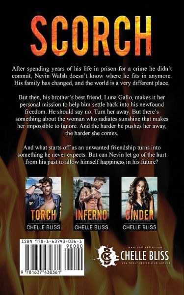 After spending years of his life in prison for a crime he didn't commit, Nevin Walsh doesn't know where he fits in anymore. His family has changed, and the world is a very different place. But then, his brother's best friend, Luna Gallo, makes it her personal mission to help him settle back into his newfound freedom. He should say no. Turn her away. But there's something about the woman who radiates sunshine that makes her impossible to ignore. And the harder he pushes her away, the harder she comes. And what starts off as an unwanted friendship turns into something he never expects. But can Nevin let go of the hurt from his past to allow himself happiness in his future? Scorch is the tenth full-length standalone novel in the Men of Inked Heatwave series by Wall Street Journal and USA Today bestselling author Chelle Bliss.