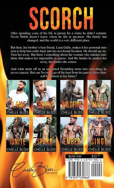 After spending years of his life in prison for a crime he didn't commit, Nevin Walsh doesn't know where he fits in anymore. His family has changed, and the world is a very different place. But then, his brother's best friend, Luna Gallo, makes it her personal mission to help him settle back into his newfound freedom. He should say no. Turn her away. But there's something about the woman who radiates sunshine that makes her impossible to ignore. And the harder he pushes her away, the harder she comes. And what starts off as an unwanted friendship turns into something he never expects. But can Nevin let go of the hurt from his past to allow himself happiness in his future? Scorch is the tenth full-length standalone novel in the Men of Inked Heatwave series by Wall Street Journal and USA Today bestselling author Chelle Bliss.