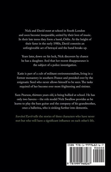 "Music was my refuge. I could crawl into the space between the notes and curl my back to loneliness." Nick and David meet at school in South London and soon become inseparable, united by their love of music. In their late teens they form a band, Orfée. At the height of their fame in the early 1980s, David commits an unforgiveable act of betrayal and the band breaks up. Years later, down on his luck, Nick discovers by chance he has a daughter. And that her recent disappearance is the subject of a police investigation. Katie is part of a cult of militant environmentalists, living in a former monastery in southern France and presided over by the enigmatic Seed who never allows himself to be seen. The tasks required of her become ever more frightening and sinister. Sam Pearson, thirteen years old, is being bullied at school. He has only two havens - the role model Nick Swallow provides as he learns to play the bass guitar and the company of his grandmother, once a ballerina, who is sinking further into dementia. Scorched Earth tells the stories of three characters who have never met but who will have a significant influence on each other's life.