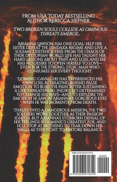 From USA Today bestselling author Rebecca Hefner Two broken souls collide as ominous threats emerge... Arianna Lawson has one goal: help her sister defeat the Sendaxa regime and live a solemn existence free from the chaos of their dystopian world. Life has taught her hard lessons about pain and loss, and she has no desire to open herself to love-even for the strong, stoic man who consumes her every thought. Dominic Cavalleri has experienced his own loss, retreating behind false emotion to bury the pain. After sustaining a life-threatening injury, he's determined to change his ways-and to explore the emotion he saw in Arianna's gorgeous eyes when he was moments from death. Thrust into a dangerous mission, the two soldiers work together as their passion ignites. But Arianna's stubborn denial of her feelings is Dominic's greatest foe, and he'll stop at nothing to tear down her walls as they fight to restore balance. If you love a reverse grumpy-sunshine story (she's grumpy!) with a hero determined to bestow the love his woman deserves, a side of smokin' hot romance, and a race to save the world, this book is for you! Settle in and enjoy!