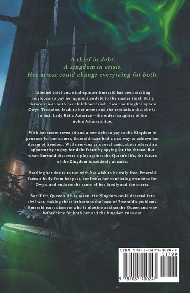 A thief in debt. A kingdom in crisis. Her arrest could change everything for both. Talented thief and wind-spinner Emerald has been stealing heirlooms to pay her apprentice debt to the master thief. But a chance run-in with her childhood crush, now one Knight Captain Owyn Tramaine, leads to her arrest and the revelation that she is, in fact, Lady Keira Azfarran-the eldest daughter of the noble Azfarran line. With her secret revealed and a new debt to pay to the Kingdom in penance for her crimes, Emerald must find a new way to achieve her dream of freedom. While serving as a royal maid, she is offered an opportunity to pay her debt faster by spying for the throne. But when Emerald discovers a plot against the Queen's life, the future of the Kingdom is suddenly at stake. Battling her desire to run with her wish to be truly free, Emerald faces a bully from her past, confronts her conflicting emotions for Owyn, and endures the scorn of her family and the courts. But if the Queen's life is taken, the Kingdom could descend into civil war, making these irritations the least of Emerald's problems. Emerald must discover who is plotting against the Queen and why before time for both her and the kingdom runs out.