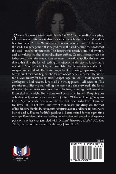 Scorned Testimony, Healed Gift: Revelation 12:11 wants to display a gritty, translucent testimony so that its reader can be healed, delivered, and set free. In chapter 2, "The Womb," rejection was the inheritance of the womb, the seed. The very person that helped make the seed became the shadow of the seed--incubating rejection. The damage was already done in the womb, and everything that her father did didn't suffice. General Motors took her father away when she needed him the most--rejection. Spoiled she was, but that didn't shift the fact of feeding the rejection with rejected love--more rejection. Soon after he left, he found his mischief--more rejection. He was pronounced dead. The beginning of her life, turning topsy-turvy--the bitterness of rejection begins. She trusted one of her classmates. "Her uncle took RR's beauty for his ugliness." Anger, rage, murder--more rejection. She began to find rejected love in all the wrong places--self-rejection. The promiscuous lifestyle was calling her name and she answered. She knew that the rejected love shown was lust at its best, suffering--self-rejection. Entangled in the night lifestyle but loved every bit of its hell. Dropping out of high school, she was over it--more rejection. "What am I doing? Why am I here? My mother didn't raise me like this, but I want to be loved. I want to feel loved. This is not love." The love of money, sex, and drugs was the root of her fantasy. Her body, her sanity, her spiritualism, and her emotions were buried and suffocated by life's quicksand. Satan waited for the right time to target Pernicious. She was feeding the rejection and placed in the gravest positions she has ever gambled with. Scorned Testimony, Healed Gift: Rev. 12:11, the memoir of a survivor through Jesus Christ!