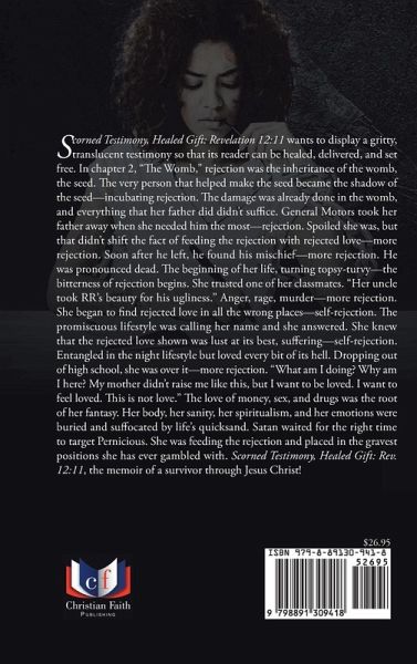 Scorned Testimony, Healed Gift: Revelation 12:11 wants to display a gritty, translucent testimony so that its reader can be healed, delivered, and set free. In chapter 2, "The Womb," rejection was the inheritance of the womb, the seed. The very person that helped make the seed became the shadow of the seed--incubating rejection. The damage was already done in the womb, and everything that her father did didn't suffice. General Motors took her father away when she needed him the most--rejection. Spoiled she was, but that didn't shift the fact of feeding the rejection with rejected love--more rejection. Soon after he left, he found his mischief--more rejection. He was pronounced dead. The beginning of her life, turning topsy-turvy--the bitterness of rejection begins. She trusted one of her classmates. "Her uncle took RR's beauty for his ugliness." Anger, rage, murder--more rejection. She began to find rejected love in all the wrong places--self-rejection. The promiscuous lifestyle was calling her name and she answered. She knew that the rejected love shown was lust at its best, suffering--self-rejection. Entangled in the night lifestyle but loved every bit of its hell. Dropping out of high school, she was over it--more rejection. "What am I doing? Why am I here? My mother didn't raise me like this, but I want to be loved. I want to feel loved. This is not love." The love of money, sex, and drugs was the root of her fantasy. Her body, her sanity, her spiritualism, and her emotions were buried and suffocated by life's quicksand. Satan waited for the right time to target Pernicious. She was feeding the rejection and placed in the gravest positions she has ever gambled with. Scorned Testimony, Healed Gift: Rev. 12:11, the memoir of a survivor through Jesus Christ!