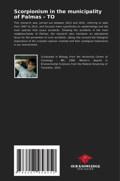 This research was carried out between 2013 and 2015, referring to data from 2007 to 2013, and focused more specifically on epidemiology and the main species that cause accidents. Showing the accidents in the main neighbourhoods of Palmas, the research also maintains an educational focus for the prevention of such accidents, taking into account the biological importance of the scorpion species involved and their ecological importance in our environment.