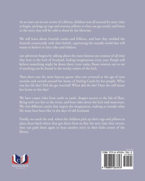 As we start out in our corner of a library, children wait all around for story time to begin, picking up rugs and oversize pillows so they can get comfy and listen to the story that will be told to them by the librarian. We will learn about Scottish castles and folklore, and how they molded the Scottish countryside with their beliefs, captivating the outside world that still wants to believe in fairy tales and folklore. our adventure begins by talking about the most famous sea creature of all time that lives in the loch of Scotland, fueling imaginations every year. People still believe something might be down there, even today. Boats venture out to see if anything can be found in the murky waters of the loch. Then there was the most famous queen who was crowned at the age of nine months and carried around her home of Stirling Castle by her people. What was her life like? Did she get married? When did she die? Does she still haunt her home to this day? We have carpet rides from castle to castle, dragon escorts to the Isle of Skye, flying with our feet in the rivers, and boat rides down the loch and waterways. We visit different castles that inspire the imagination, making us wonder what life must have been like in the days of old Scotland. Finally, we reach the end, where the children pick up their rugs and pillows to place them back where they got them from so that the next time they return, they can grab them again to hear another story in their little corner of the library.