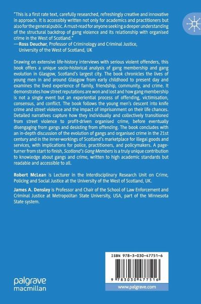 Drawing on extensive life-history interviews with serious violent offenders, this book offers a unique socio-historical analysis of gang membership and gang evolution in Glasgow, Scotland's largest city. The book chronicles the lives of young men in and around Glasgow from early childhood to present day and examines the lived experience of family, friendship, community, and crime. It demonstrates how street reputations are won and lost and how gang membership is not a single event but an experiential process of offending, victimisation, consensus, and conflict. The book follows the young men's descent into knife crime and street violence and the impact of imprisonment on their life chances. Detailed narratives capture how they individually and collectively transitioned from street violence to profit-driven organised crime, before eventually disengaging from gangs and desisting from offending. The book concludes with an in-depth discussion of the evolution of gangs and organised crime in the 21st century and in the inner-workings of Scotland's marketplace for illegal goods and services, with implications for police, practitioners, and policymakers. A page-turner from start to finish, Scotlands' Gang Members is a truly unique contribution to knowledge about gangs and crime, written to high academic standards but readable and accessible to all.