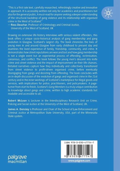 Drawing on extensive life-history interviews with serious violent offenders, this book offers a unique socio-historical analysis of gang membership and gang evolution in Glasgow, Scotland's largest city. The book chronicles the lives of young men in and around Glasgow from early childhood to present day and examines the lived experience of family, friendship, community, and crime. It demonstrates how street reputations are won and lost and how gang membership is not a single event but an experiential process of offending, victimisation, consensus, and conflict. The book follows the young men's descent into knife crime and street violence and the impact of imprisonment on their life chances. Detailed narratives capture how they individually and collectively transitioned from street violence to profit-driven organised crime, before eventually disengaging from gangs and desisting from offending. The book concludes with an in-depth discussion of the evolution of gangs and organised crime in the 21st century and in the inner-workings of Scotland's marketplace for illegal goods and services, with implications for police, practitioners, and policymakers. A page-turner from start to finish, Scotlands' Gang Members is a truly unique contribution to knowledge about gangs and crime, written to high academic standards but readable and accessible to all.
