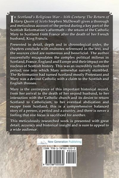 In Scotland's Religious War - 16th Century: The Return of Mary Queen of Scots Stephen McDowall gives a thorough and meticulous account of the period during a key part of the Scottish Reformation's aftermath - the return of the Catholic Mary to Scotland from France after the death of her French husband, King Francis. Presented in detail, depth and in chronological order, the chapters conclude with endnotes referenced in the text, and the sources cited are numerous and beneficial. The author successfully encapsulates the complex political milieus in Scotland, France, England and Europe and their impact on the nucleus of Scottish history. This was an incredibly turbulent period; one into which Mary somewhat naively stumbled. The Reformation had turned Scotland mostly Protestant and Mary was a devout Catholic with a claim to the Scottish and English thrones Mary is the centrepiece of this important historical record, from her arrival to the death of her second husband, to her interaction with the Catholic church and its desire to return Scotland to Catholicism, to her eventual abdication and escape from Scotland, this is a comprehensive balanced story of a person, a period and a country, and there is never a feeling that one focus is sacrificed for another. This meticulously researched work is presented with great detail, accuracy and historical insight and is sure to appeal to a wide audience.