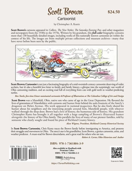 Scott Brown Cartoonist is about Scott Brown who was a nationally known cartoonist and proprietor of Brown's Drugstore and Soda Shop in Mansfield, Ohio, which served up "the largest, coldest and best chocolate sodas on route 30" along with chuckles, gags, and checkers. Brown's cartoons appeared in Colliers, The New Yorker, The Saturday Evening Post, and other magazines and newspapers from the 1930s to the 1970s. For the first time ever, Scott Brown's cartoons and stories, set within the context of his life, are presented in this full-color biography written by his grandson Chris Kuntz. Included are more than 130 images including beautifully detailed examples of his works from multiple private collections and museum archives-many that have never before been seen by the public. This biography also describes his forefather's journey to American and describes the trials they endured when arriving in the wilderness of Ohio, as well as genealogical information about the family.