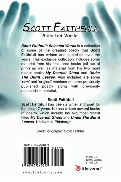 Scott Faithfull: Selected Works is a collection of some of the greatest poetry that Scott Faithfull has written and published over the years. This exclusive collection includes some material from his first three books (all out of print) as well as material from his two most recent books "My Dearest Ghost" and "Under The Burnt Leaves." Also included are some 'new' and 'original' versions of some previously published poetry along with previously unpublished material.