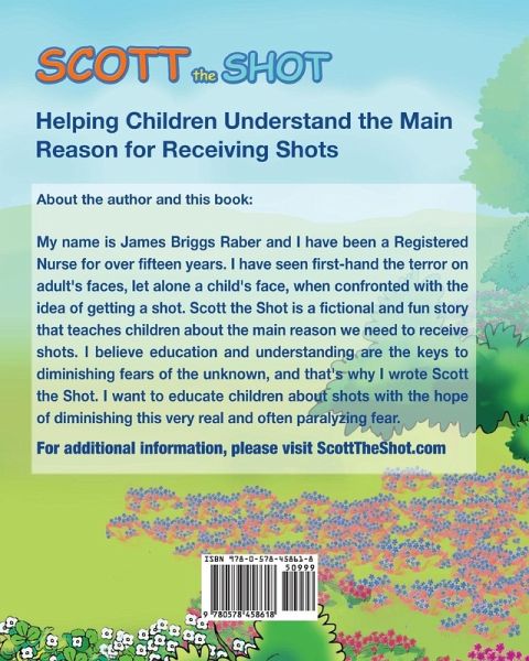 Scott the Shot is a fun and fictional picture book that was written to educate children about the main reason for receiving shots. Scott the Shot is a dear friend of the children of Childrensburg. He can often be found playing with children, but noticed that when his friends got sick, their pills and cough syrups wouldn't help them feel better. Scott the Shot decides to begin a journey to find the Medicine Maker with the hope that he can make a medicine to prevent the children from becoming so sick. Scott the Shot finds the Medicine Maker, but runs into an obstacle: the Medicine Maker has made all kinds of medicines to help the children, but can't seem to find a way to inject the medicine into the children's bodies. Scott the Shot suddenly finds himself in a unique position to help the Medicine Maker give these special medicines to his friends. The story is thirty-two pages in length and is filled with twenty-eight vibrant illustrations. The author has also included a website that has coloring pages, mazes, and additional information on injections.