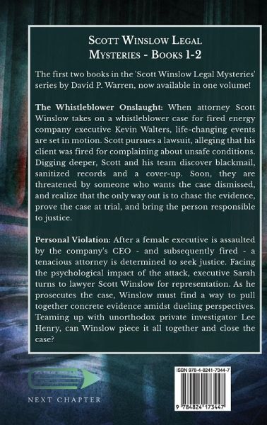 The first two books in the 'Scott Winslow Legal Mysteries' series by David P. Warren, now available in one volume! The Whistleblower Onslaught: When attorney Scott Winslow takes on a whistleblower case for fired energy company executive Kevin Walters, life-changing events are set in motion. Scott pursues a lawsuit, alleging that his client was fired for complaining about unsafe conditions. Digging deeper, Scott and his team discover blackmail, sanitized records and a cover-up. Soon, they are threatened by someone who wants the case dismissed, and realize that the only way out is to chase the evidence, prove the case at trial, and bring the person responsible to justice. Personal Violation: After a female executive is assaulted by the company's CEO - and subsequently fired - a tenacious attorney is determined to seek justice. Facing the psychological impact of the attack, executive Sarah turns to lawyer Scott Winslow for representation. As he prosecutes the case, Winslow must find a way to pull together concrete evidence amidst dueling perspectives. Teaming up with unorthodox private investigator Lee Henry, can Winslow piece it all together and close the case?
