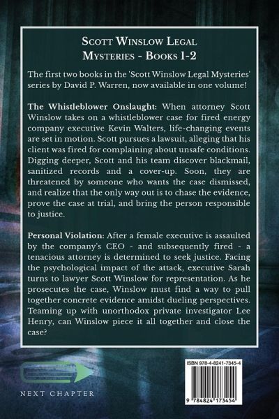 The first two books in the 'Scott Winslow Legal Mysteries' series by David P. Warren, now available in one volume! The Whistleblower Onslaught: When attorney Scott Winslow takes on a whistleblower case for fired energy company executive Kevin Walters, life-changing events are set in motion. Scott pursues a lawsuit, alleging that his client was fired for complaining about unsafe conditions. Digging deeper, Scott and his team discover blackmail, sanitized records and a cover-up. Soon, they are threatened by someone who wants the case dismissed, and realize that the only way out is to chase the evidence, prove the case at trial, and bring the person responsible to justice. Personal Violation: After a female executive is assaulted by the company's CEO - and subsequently fired - a tenacious attorney is determined to seek justice. Facing the psychological impact of the attack, executive Sarah turns to lawyer Scott Winslow for representation. As he prosecutes the case, Winslow must find a way to pull together concrete evidence amidst dueling perspectives. Teaming up with unorthodox private investigator Lee Henry, can Winslow piece it all together and close the case?