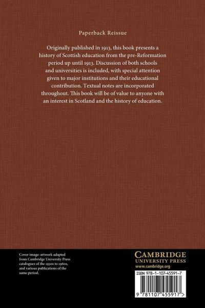 Originally published in 1913, this book presents a history of Scottish education from the pre-Reformation period up until 1913. Discussion of both schools and universities is included, with special attention given to major institutions and their educational contribution. Textual notes are incorporated throughout. This book will be of value to anyone with an interest in Scotland and the history of education.