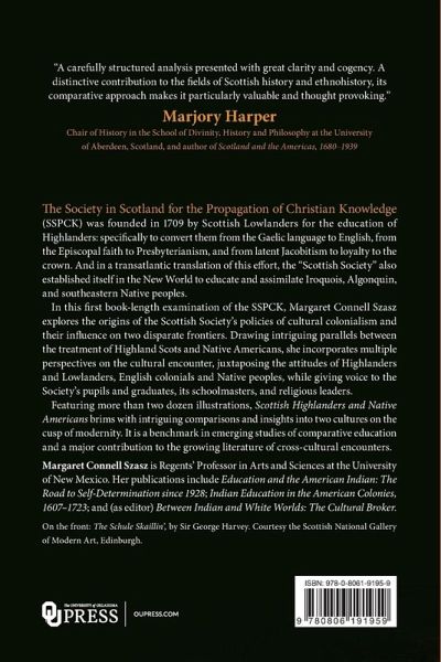 The Society in Scotland for the Propagation of Christian Knowledge (SSPCK) was founded in 1709 by Scottish Lowlanders for the education of Highlanders: specifically to convert them from the Gaelic language to English, from the Episcopal faith to Presbyterianism, and from latent Jacobitism to loyalty to the crown. In a transatlantic translation of this effort, the "Scottish Society" also established itself in the New World to educate and assimilate Iroquois, Algonquin, and southeastern Native peoples. In this first book-length examination of the SSPCK, Margaret Connell Szasz explores the origins of the Scottish Society's policies of cultural colonialism and their influence on two disparate frontiers. Drawing intriguing parallels between the treatment of Highland Scots and of Native Americans, she incorporates multiple perspectives on the cultural encounter, juxtaposing the attitudes of Highlanders and Lowlanders, English colonials and Native peoples, while giving voice to the Society's pupils and graduates, its schoolmasters, and religious leaders. Featuring more than two dozen illustrations, Scottish Highlanders and Native Americans brims with intriguing comparisons and insights into two cultures on the cusp of modernity. It is a benchmark in emerging studies of comparative education and a major contribution to the growing literature of cross-cultural encounters.