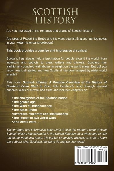 Explore the History of Scotland From Start to End... Are you interested in the romance and drama of Scottish history? Are tales of Robert the Bruce and the wars against England just footnotes in your wider historical knowledge? This book provides a concise and impressive chronicle! Scotland has always held a fascination for people around the world. from inventors and patriots to great writers and thinkers, Scotland has traditionally punched well above its weight on the world stage. But did you know how it all started and how Scotland has been shaped by wider world events? This book, Scottish History: A Concise Overview of the History of Scotland From Start to End, tells Scotland’s story through several hundred years of turmoil and strife and includes chapters on: * The emergence of the Scottish nation * The golden age * The Wars of Independence * The Black Death * Inventors, explorers and missionaries * The impact of two world wars * And much more… This in-depth and informative book aims to give the reader a taste of what Scottish history has meant for it, the United Kingdom as a whole and for the rest of the world as a result. It is perfect for anyone who has an urge to learn more about what Scotland has done throughout the years! Don’t wait another moment to enjoy from this information – Get your copy of Scottish History right away!