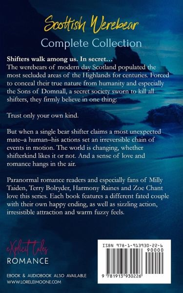 Not everyone is as human as they appear... The werebears of modern day Scotland have lived alongside humanity for centuries; hiding in plain sight. Forced to conceal their true nature from the Sons of Domnall, a secret society of humans sworn to wipe the shifters from the face of the earth, there is only one thing that is certain. Trust only your own kind. But when a single bear shifter claims a fated mate from the most unlikely of sources, a human, the discovery leads to a chain reaction that will forever change the fate of every shifter who has been forced to hide in the darkness. For better or for worse.... These love stories will change everyone's lives and even the world. Fall in love today with the Scottish Werebears Series and get all six parts in one complete collection along with some bonus stories. Shifter fans love this series! Each book features a different alpha bear and his fated mate and includes plenty of sizzling action, irresistible attraction and a happy ending for the couple, while the overarching plot of the series continues. Collection Includes: An Unexpected Affair A Dangerous Business A Forbidden Love A New Beginning A Painful Dilemma A Second Chance FREE BONUS STORY: Sugar & Spice: A Scottish Werebear Xmas
