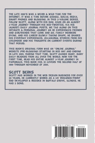 The late 1990's was a weird & wild time for the Internet. It was a time before Google, social media, smart phones and blogging. In this 2-volume series, follow Scott, along with his dog, Kegs on an almost 5-year journey through his mid-twenties. Via his (almost) daily journal posts, we tag along on this intimate & personal journey as he experiences friends and girlfriends that come and go, family members dying, and his career slowly taking shape. He shares his everyday experiences, occasional stories from his childhood and his thoughts on current events during that period.