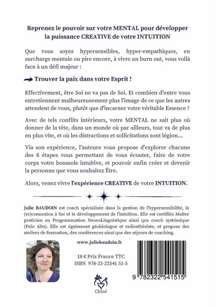 Reprenez le pouvoir sur votre MENTAL pour développer la puissance CREATIVE de votre INTUITION.Que vous soyez hypersensibles, hyper-empathiques, en surcharge mentale ou pire encore, à vivre un burn out, vous voilà face à un défi majeur : Trouver la paix dans votre Esprit !Effectivement, être Soi ne va pas de Soi. Il nous est malheureusement plus courant d'entretenir l'image de ce que les autres attendent de nous, plutôt que d'incarner notre véritable Essence.Et votre MENTAL ne sait plus raisonner avec de tels conflits intérieurs, dans un monde où, par ailleurs, tout va de plus en plus vite, et où les distractions et sollicitations sont légion.Via l'expérience de l'auteure, cet ouvrage vous donne les 8 étapes à suivre pour vous écouter, faire de votre corps votre boussole intuitive et enfin créer et devenir la personne que vous souhaitez Être.Alors, venez vivre l'expérience CREATIVE de votre INTUITION.